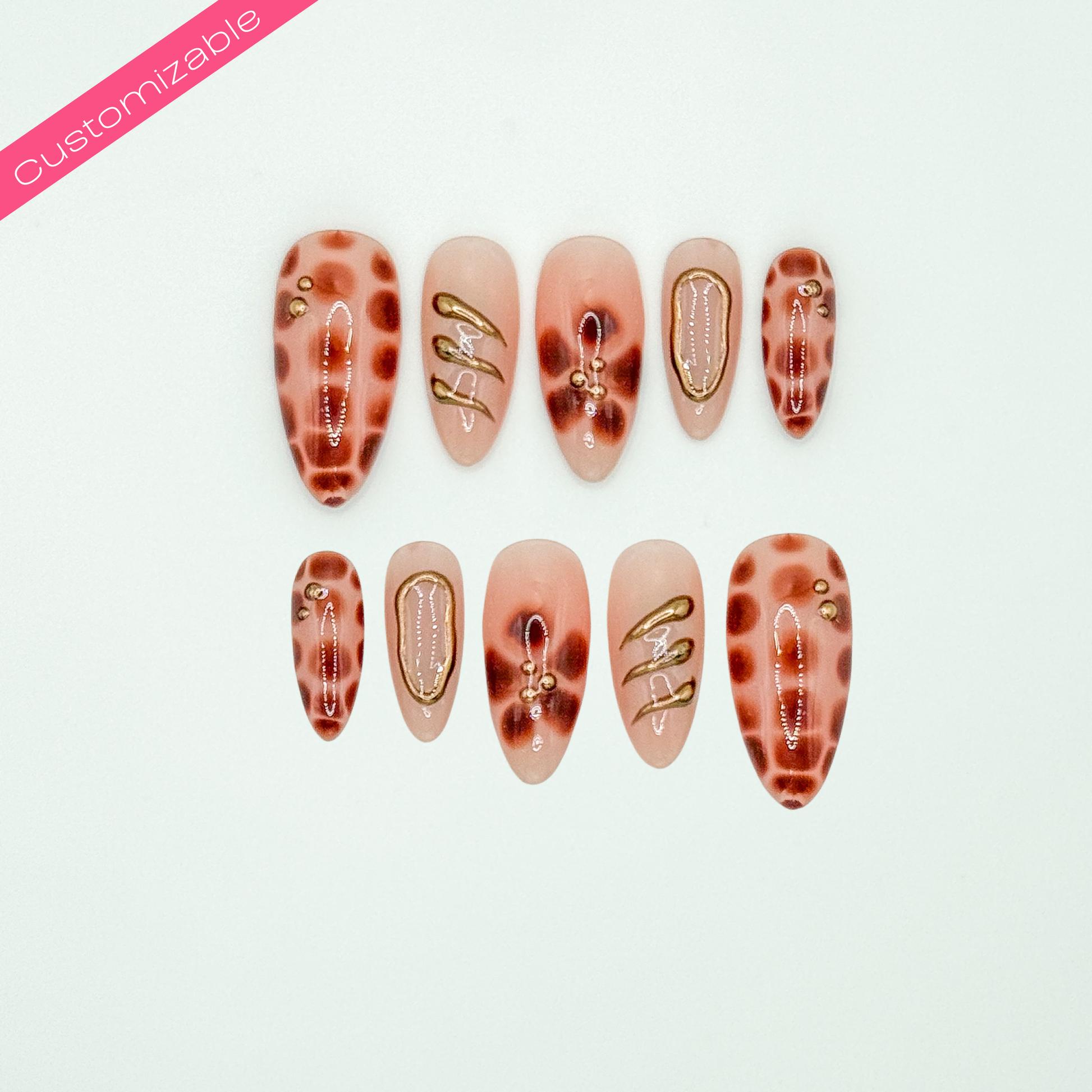 This set contains blooming gel nails with gold accents. This set can be customizable in color as well as the nail length and shape.