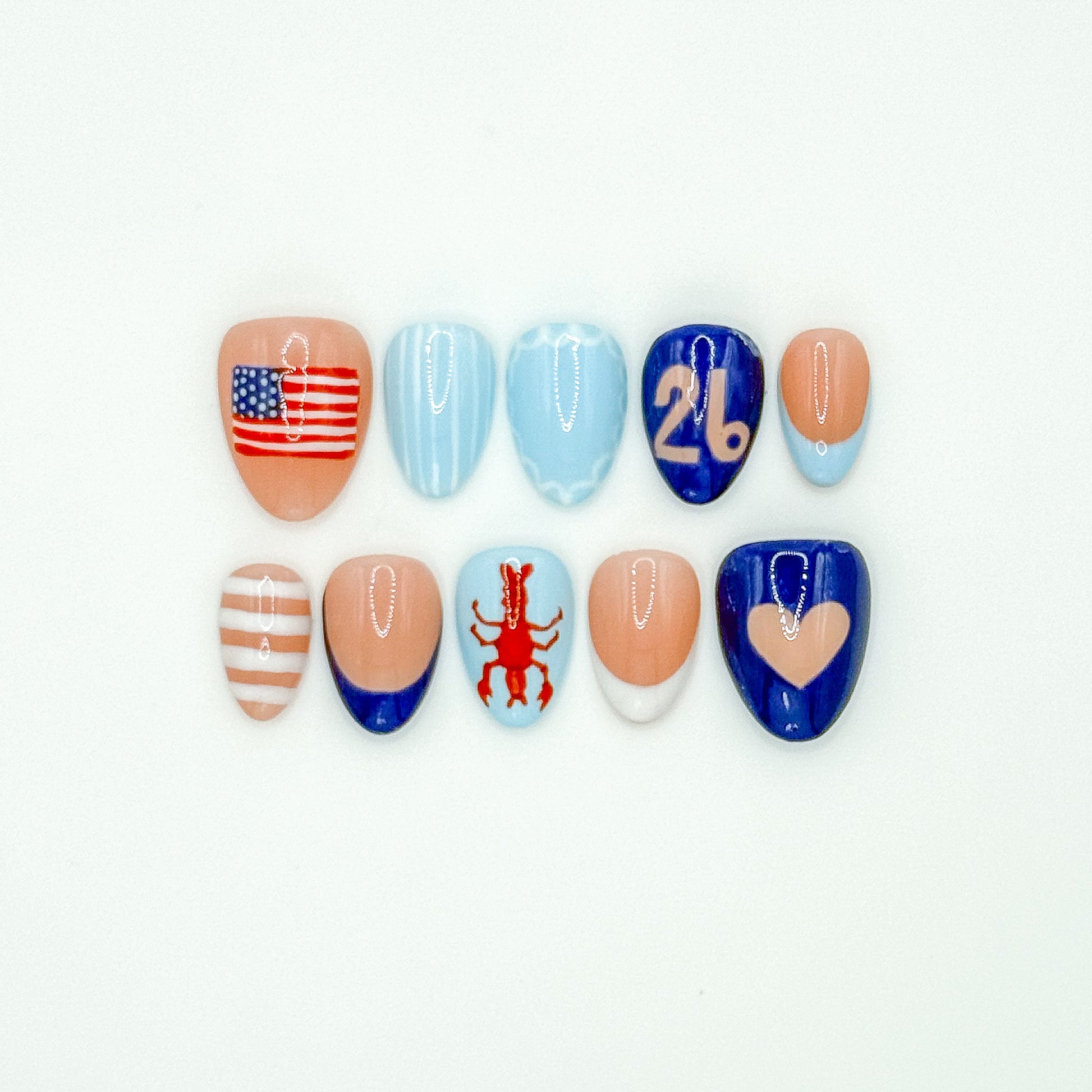 This cute little set is perfect for summer time. This set comes as is but you can change the nail length and shape.