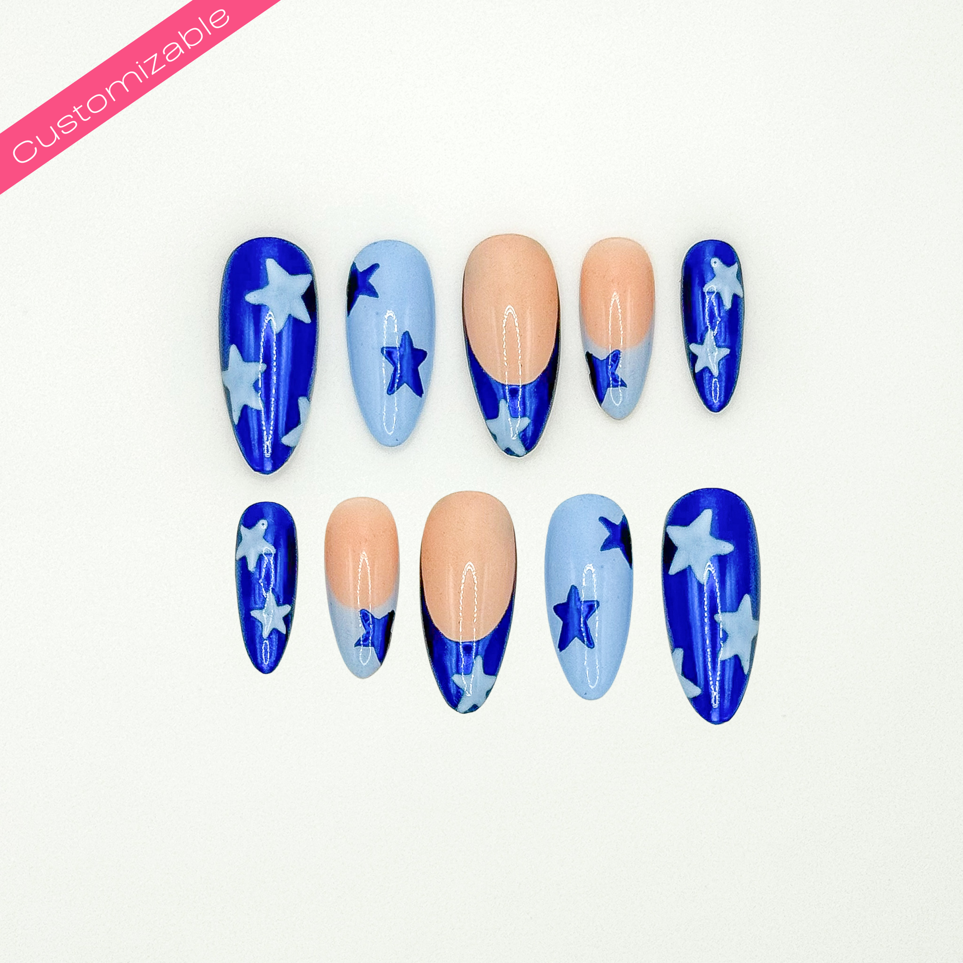 This set has both regular polish and chrome. The colors of this set can be customizable and so can the nail length and shape.