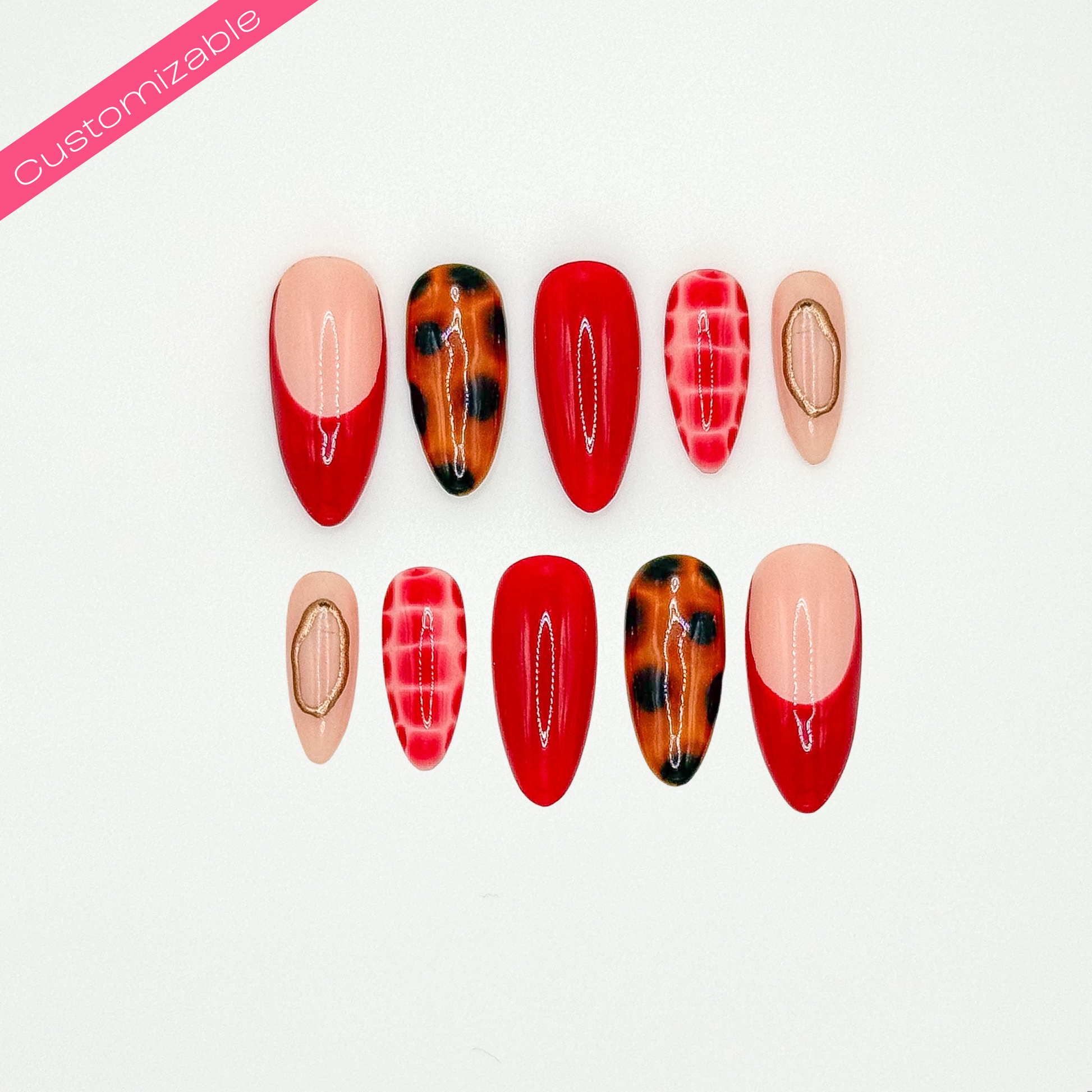 A fun nail set that has gold accents, tortoise shell, croc print and basic frenchies. This set can be customizable in color, length, and shape.