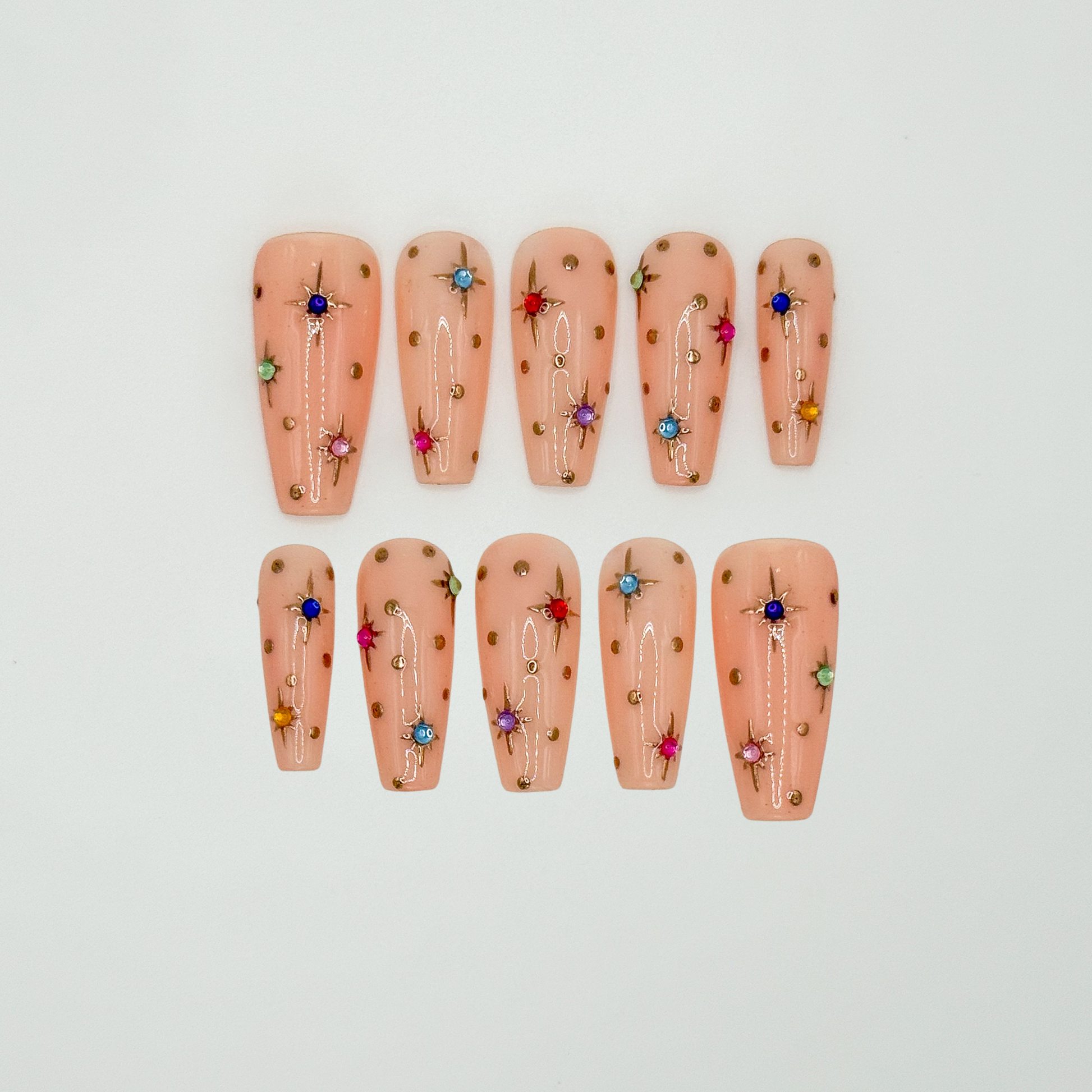 This set is simple yet elegant. It consists of gold stars and colorful gems. This set comes as is but can be customizable in the shape and size of the nails.